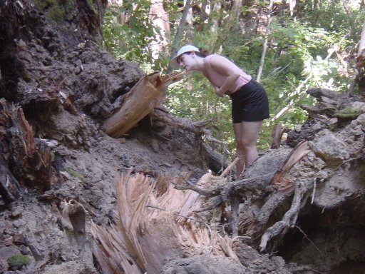 The bark is especially fire resistant. It may happen, though, that burning wood rolling down the hills get stuck on a redwood tree, and scorches the bark. After repeated fires, the fire may eventually burn through the bark, then hollowing the lower part of the tree. This is why many older trees have a large, hillside, wholes near the bottom.